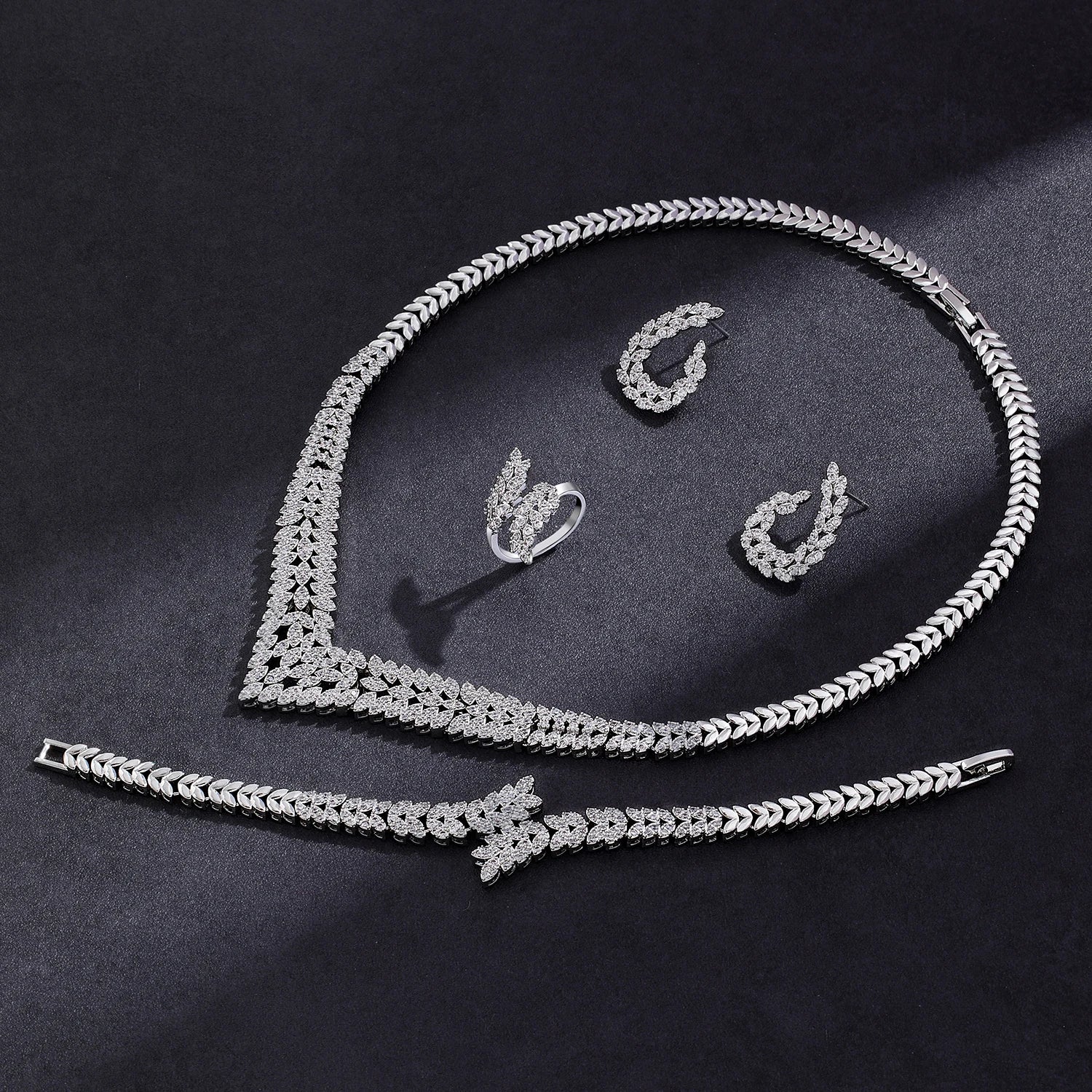- You receive a complete 4-piece bridal set, including a matching necklace and earrings, to deliver a coordinated, elegant look.
