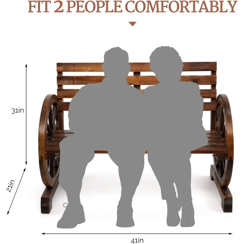 41" Rustic Wooden Wheel Bench Outdoor Bench, 2-Person Patio Bench Wagon Slatted Seat, Garden Benches for Outdoors 350lbs High Capacity, Weather Resistance