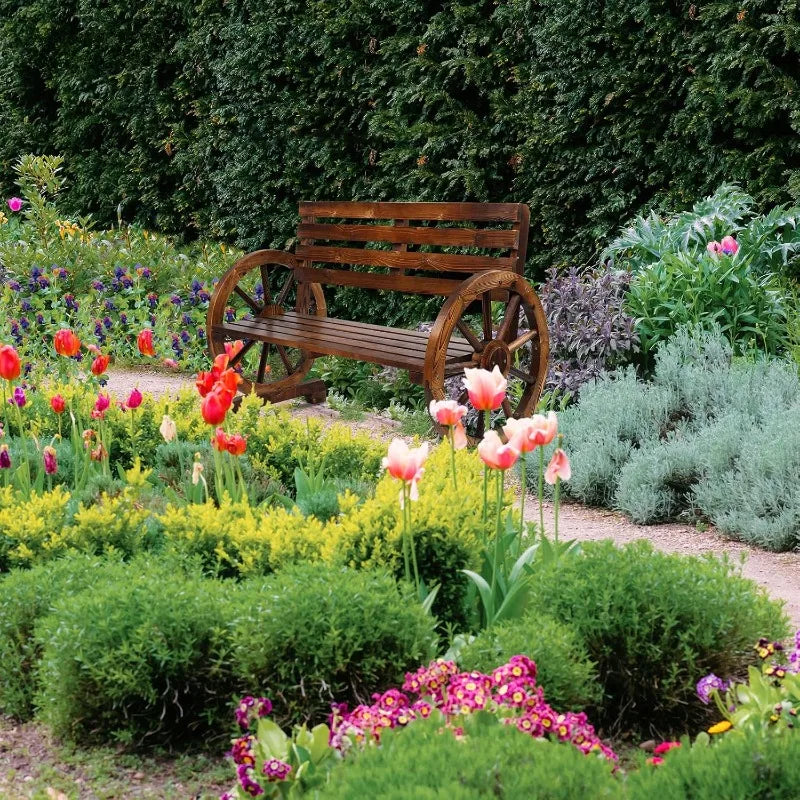 41" Rustic Wooden Wheel Bench Outdoor Bench,2-Person Patio Bench Wagon Slatted Seat,Garden Benches Outdoors 350lbs High Capacity
