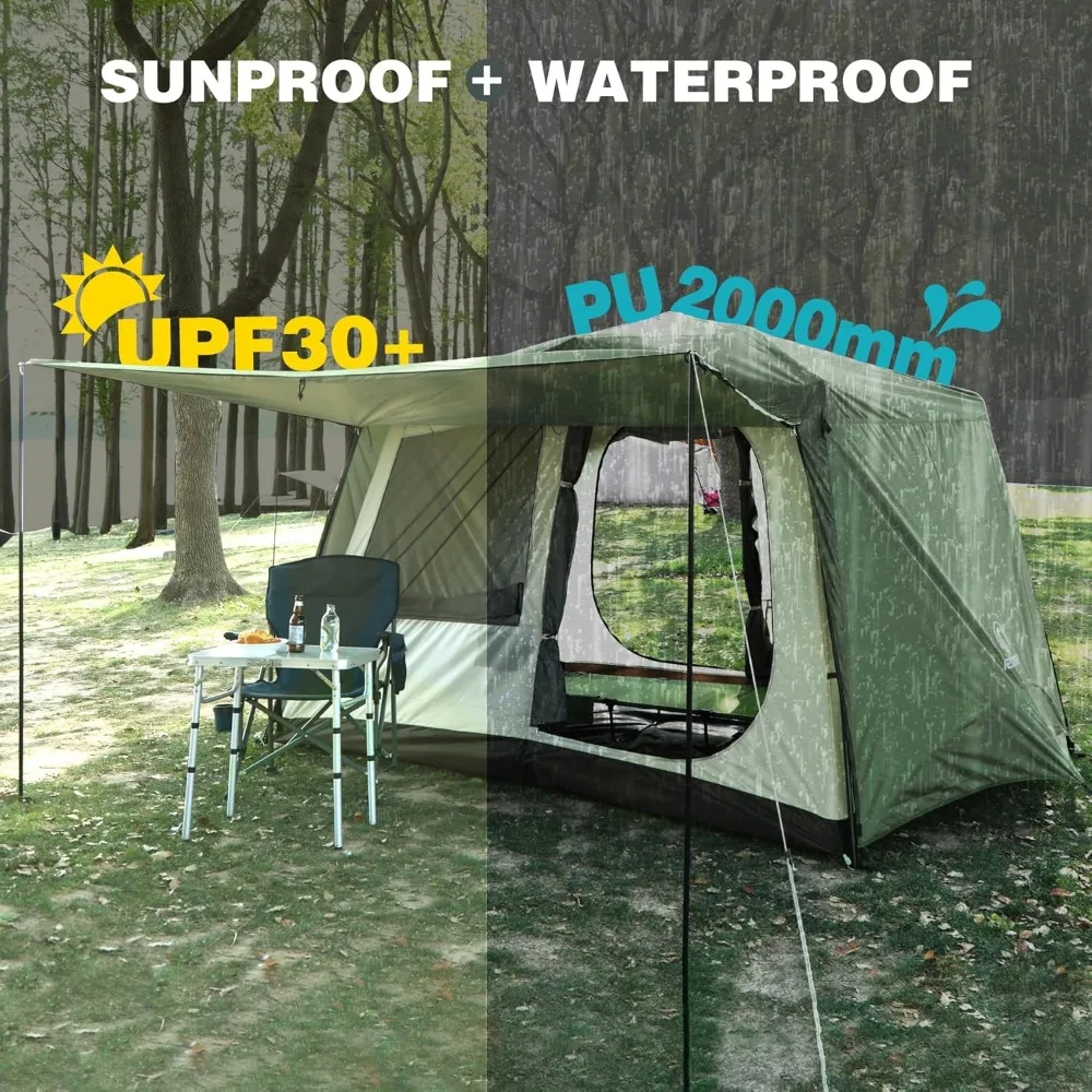 - Versatile Extended Porch: Unfold one side of the outer tent to create a shaded awning, instantly adding a leisure zone. This extra area serves as a shaded spot for relaxing, dining, or gathering, protecting you from the sun or light rain while keeping the main tent entrance accessible. It's also ideal for storing muddy boots, wet gear, or setting up a small camping kitchen, keeping the interior clean and organized.