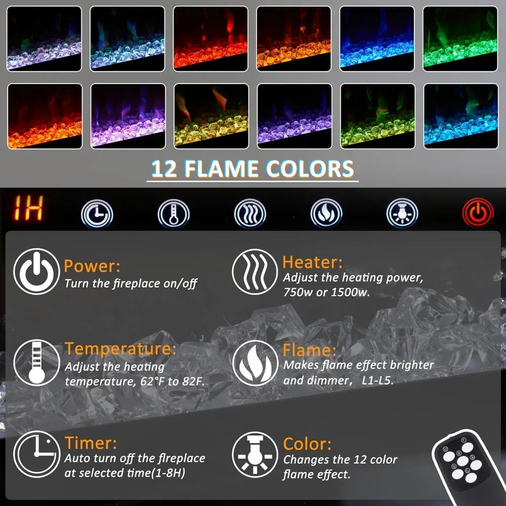 - 36" Multifunction Electric Fireplace - Fireplace insert can be used with or without heat. Temperature change, 12 realistic flame colors, time setting, and 5 level dimmer can be remote or button controlled. The fireplace heater has 2520BTU and 5100 output for warm and energy saving purpose and heats up to 400 sq. ft, creating a cozy environment for relaxation.