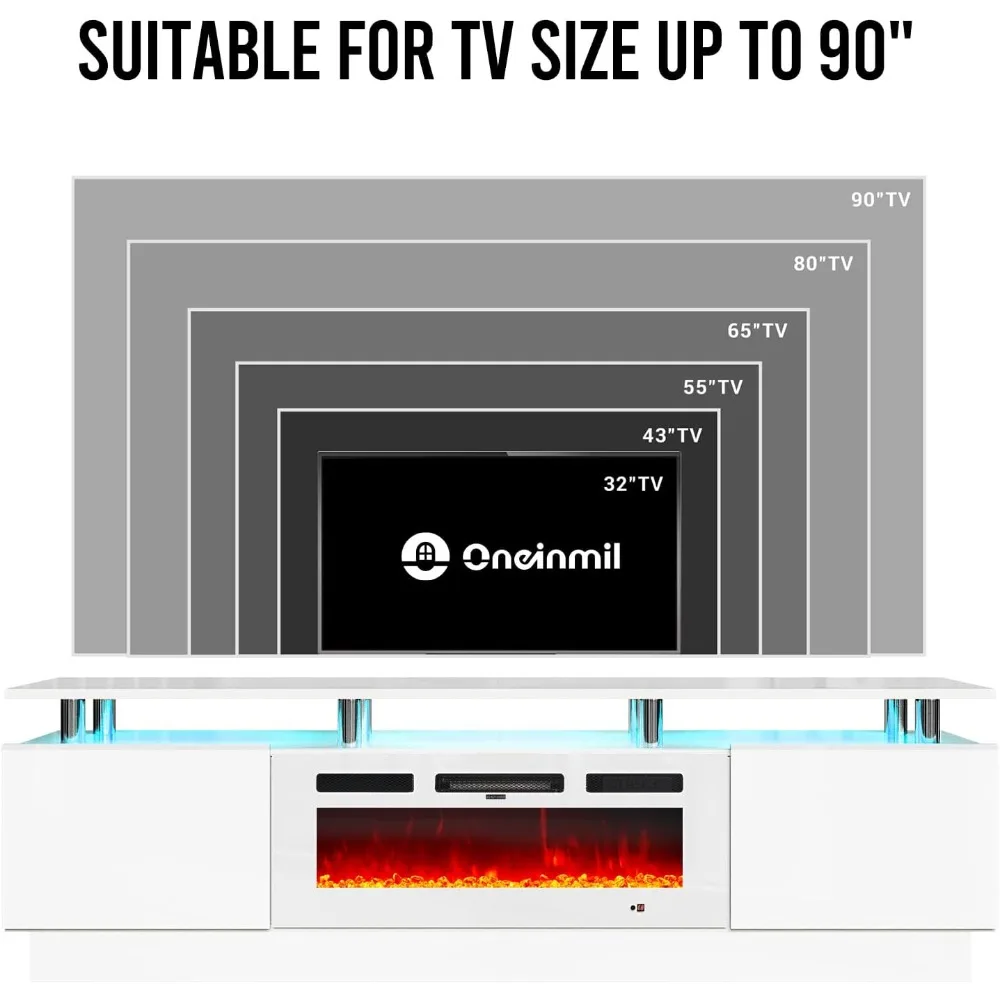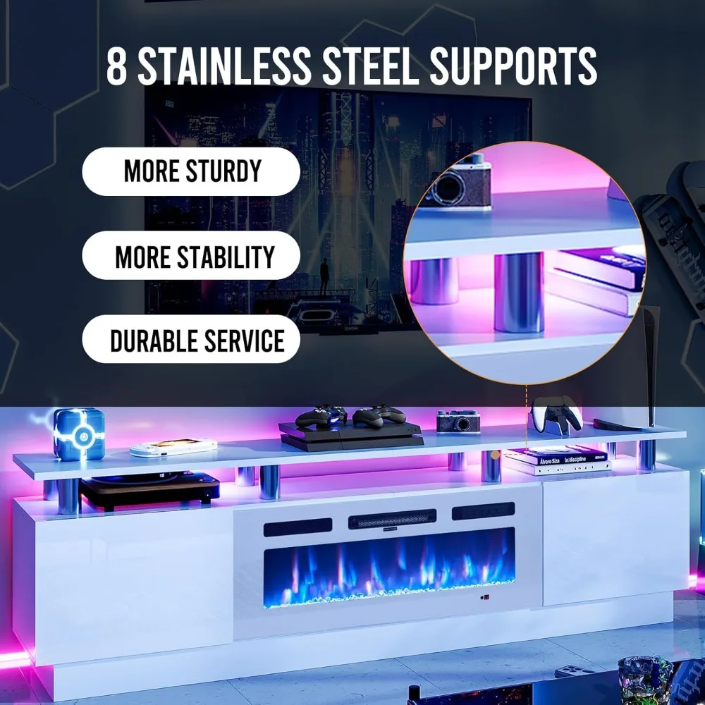 80" Modern Electric Fireplace TV Stand for TVs Up to 90 inch, with Electronic Flame and LED Lights, Luxury High Gloss Finish En