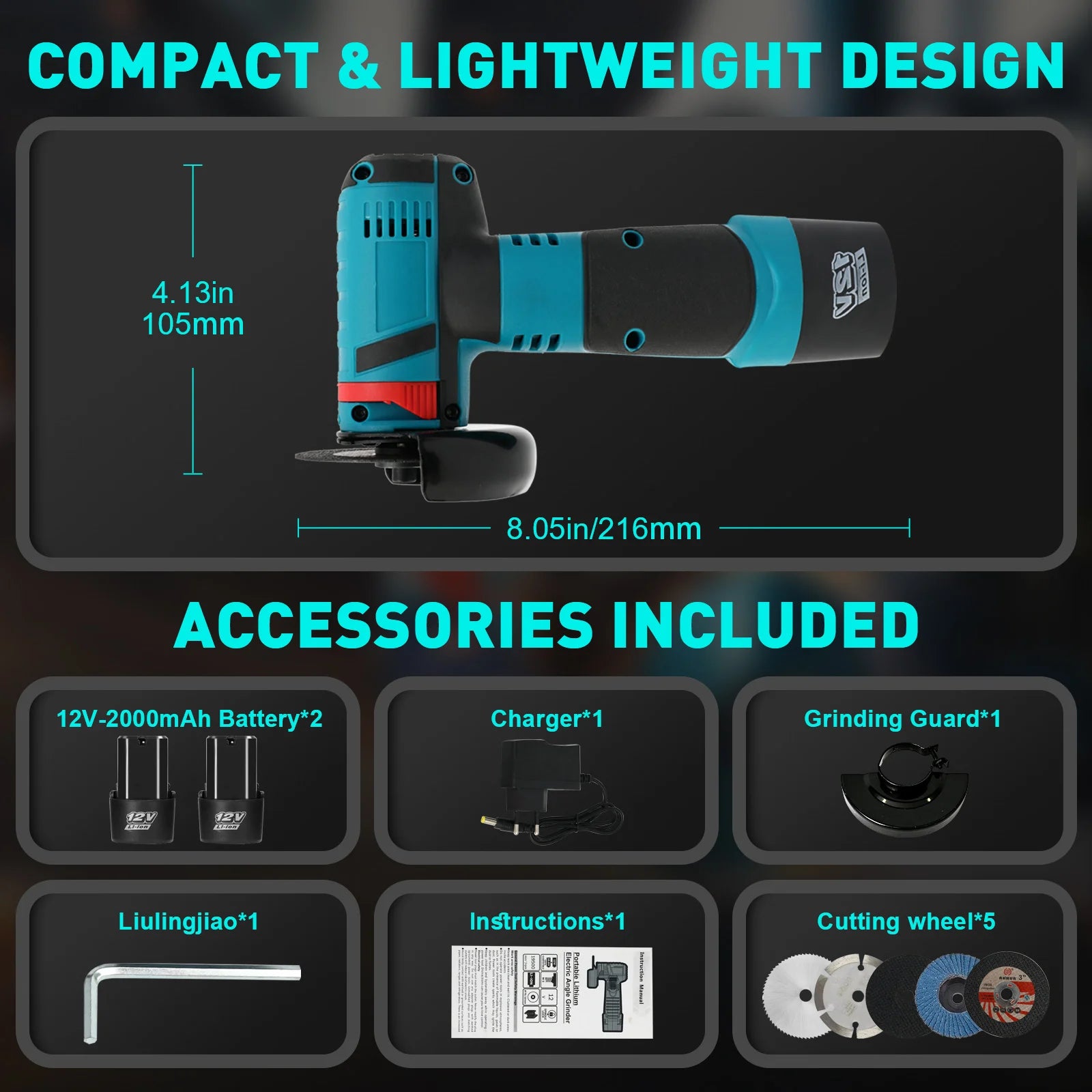 Cordless Angle Grinder Polisher 12V Brushless With 2 Batteries Charger
