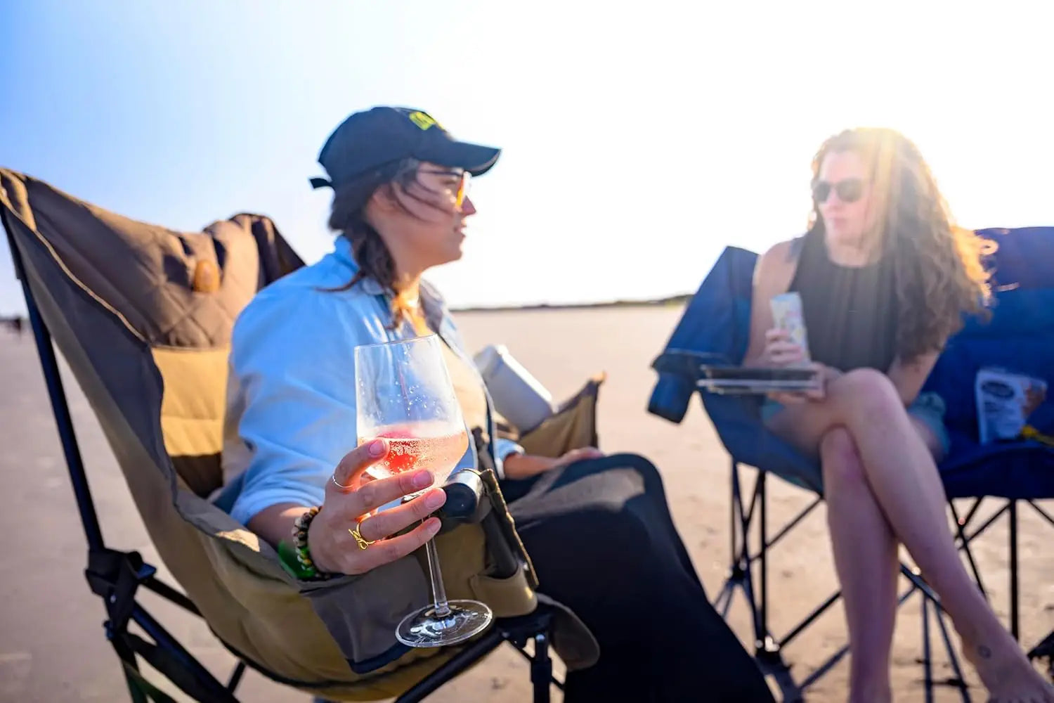 COMFORTABLE DESIGN: Padded seating and backrest offers all day comfort in the field or around basecamp, complete with wine glass and cup holders to keep your drinks within reach.
