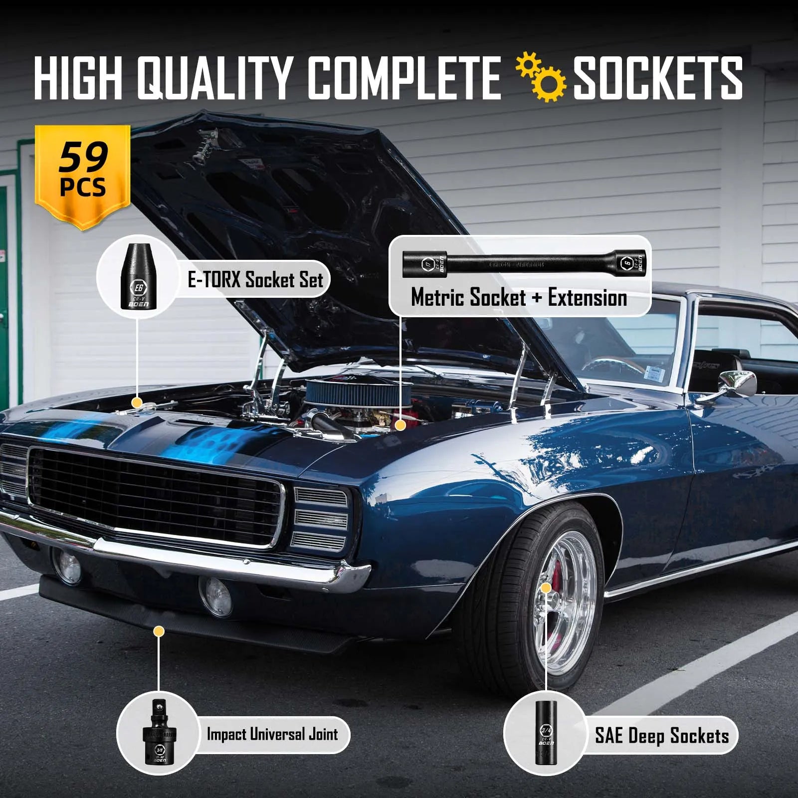 Boen 59-Piece Impact Socket Set SAE And Metric E-Torx Included