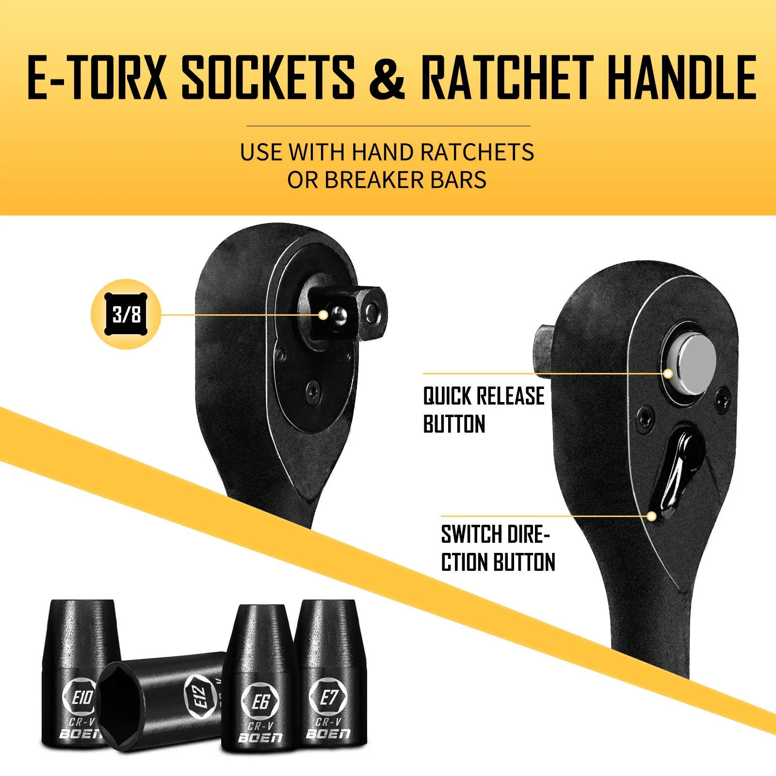 - The comprehensive range includes METRIC deep and shallow sockets, SAE sizes, and E-Torx bits from E5 to E16 for broad compatibility across vehicles and machinery.