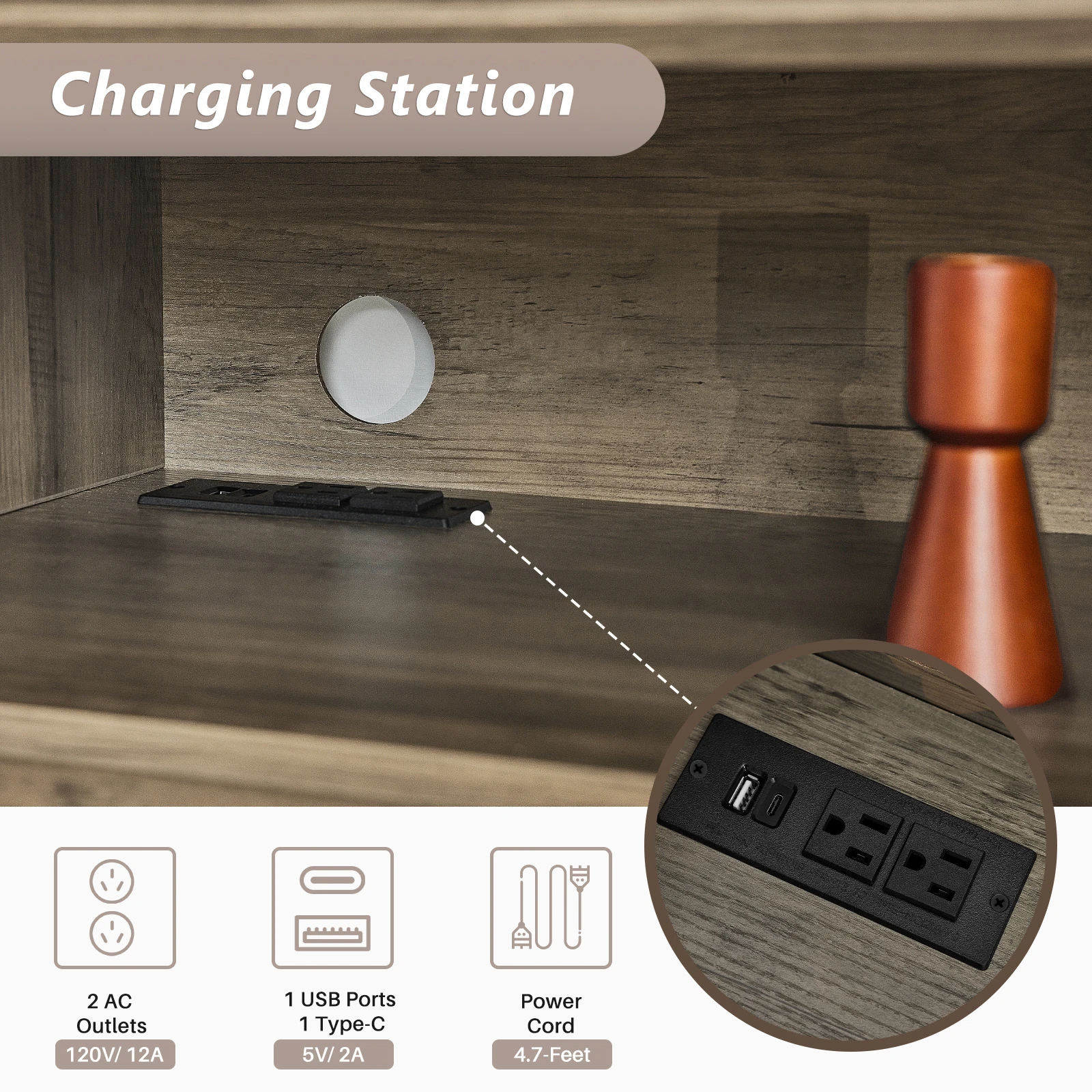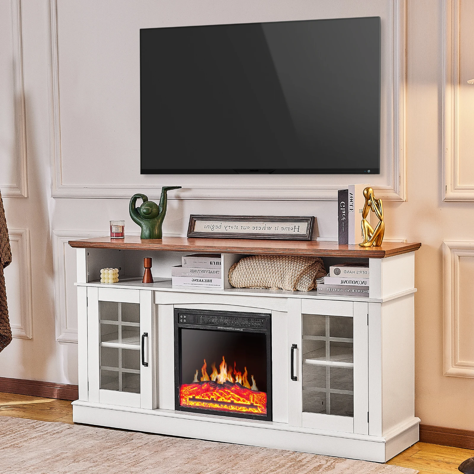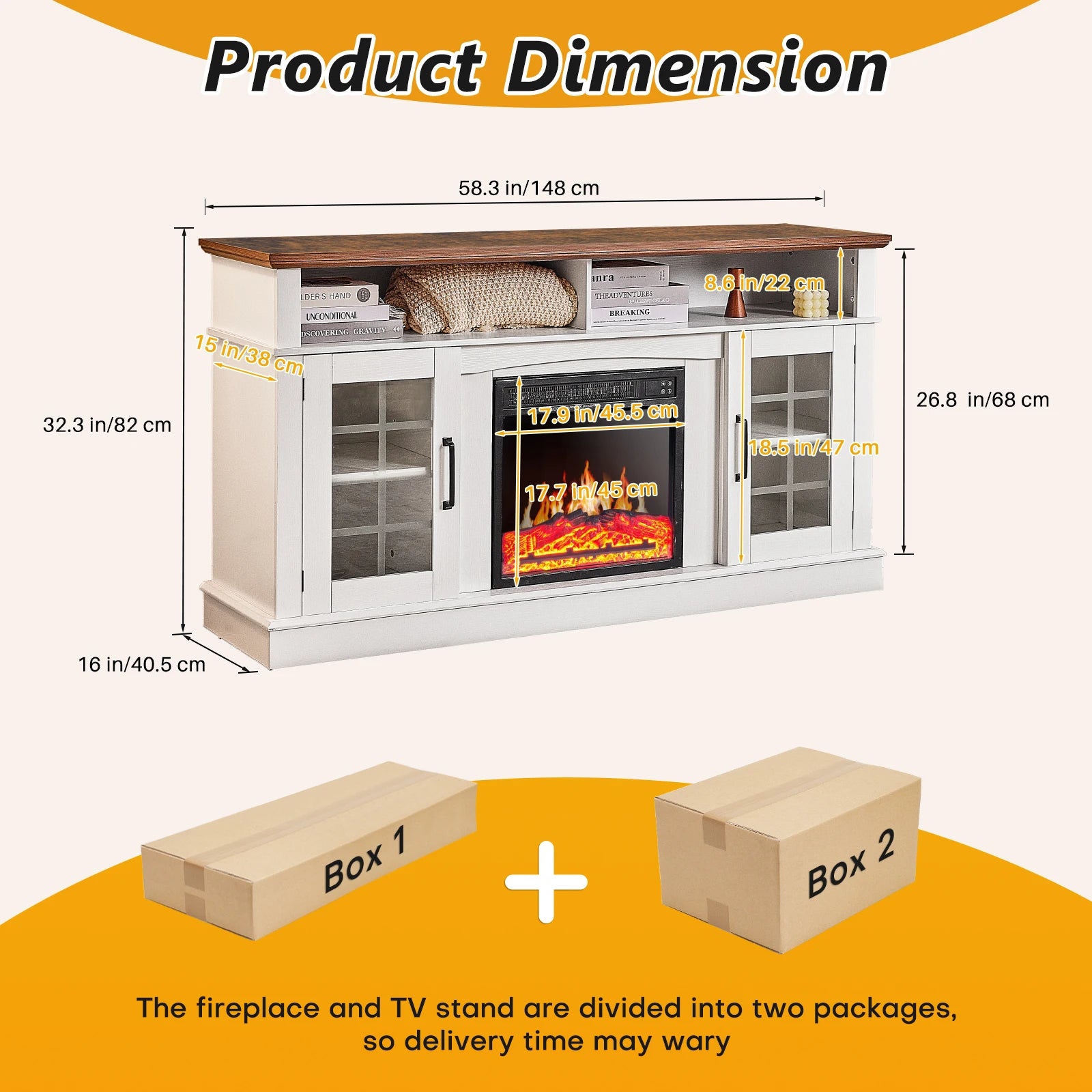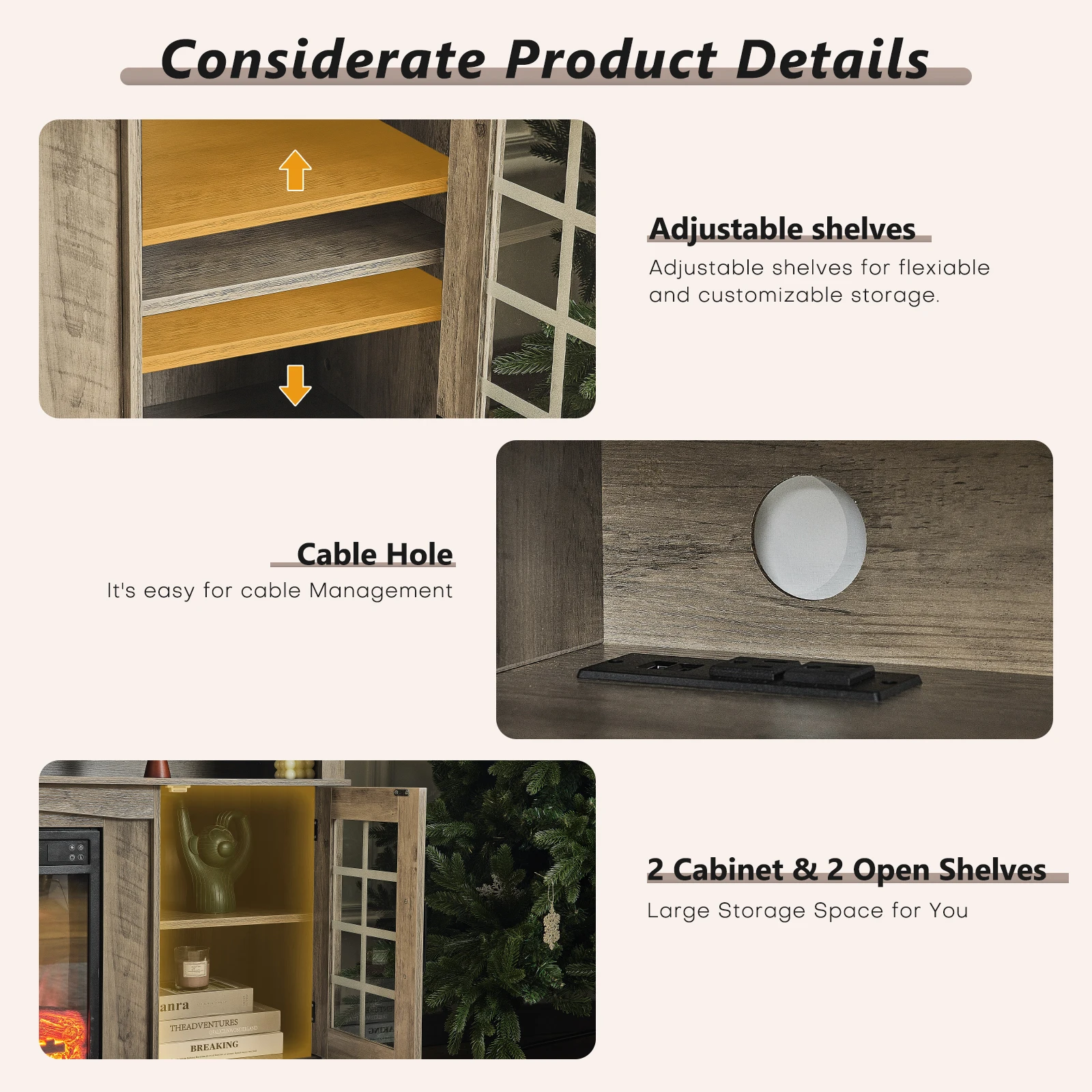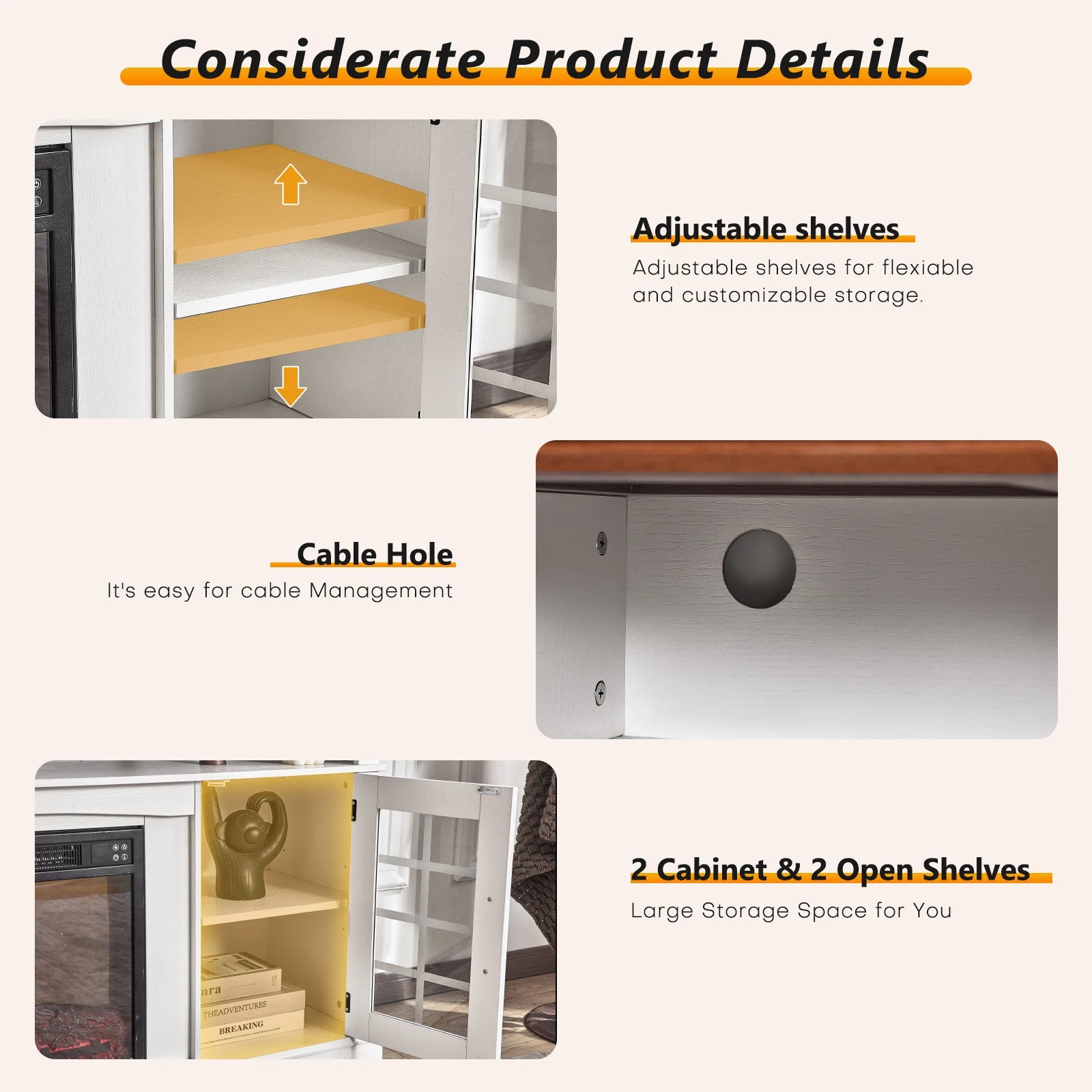 Sufficient Storage Space: This fireplace TV stand offers ample storage with a wide countertop, two open shelves, and two side cabinets. The countertop can accommodate a 65-inch TV, and the upper shelves of the side cabinets can be adjusted to 3 positions to hold items of different sizes.