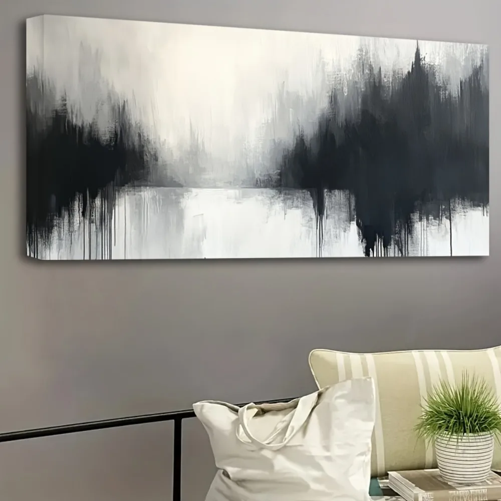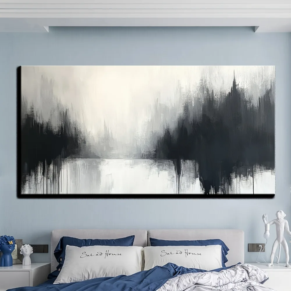 Grey and white abstract canvas painting, modern printed living room decoration, 1.5 inch thick pine solid wood frame
