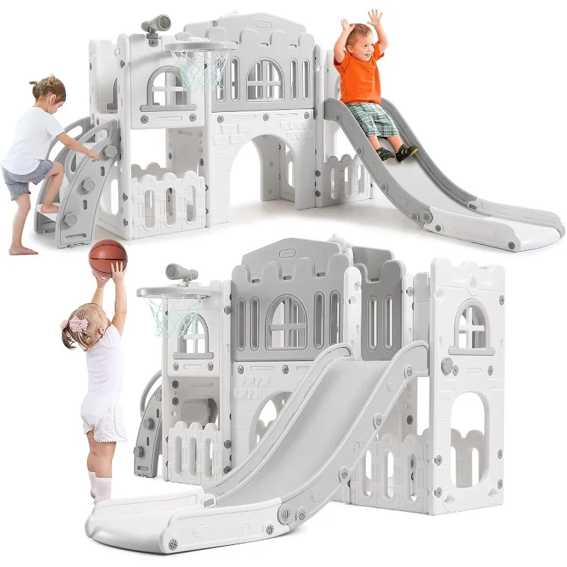 Indoor Slide Toddler Playset for Age 1-3, Kids Outdoor Playground with Slide,Basketball Hoop,Climber,Crawling Tunnel,Telescope