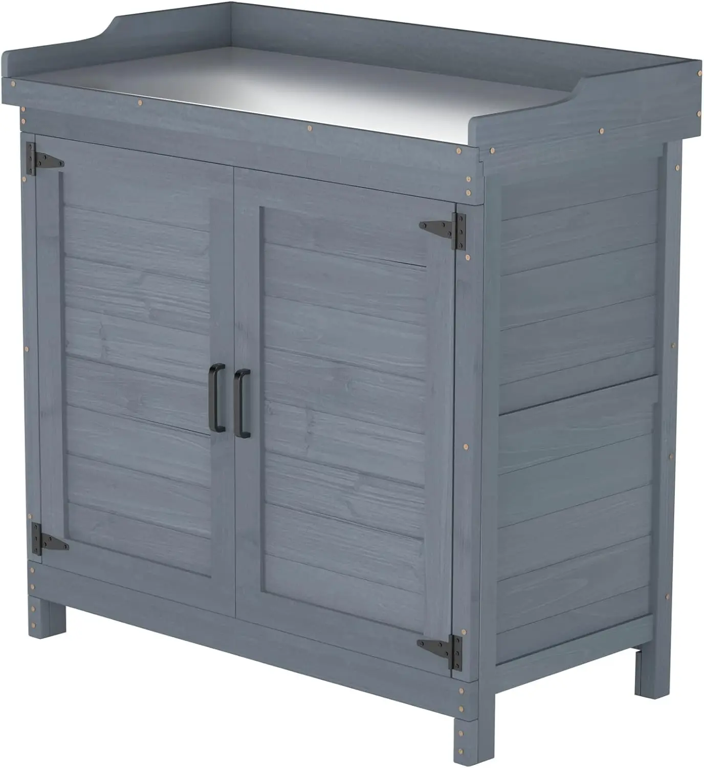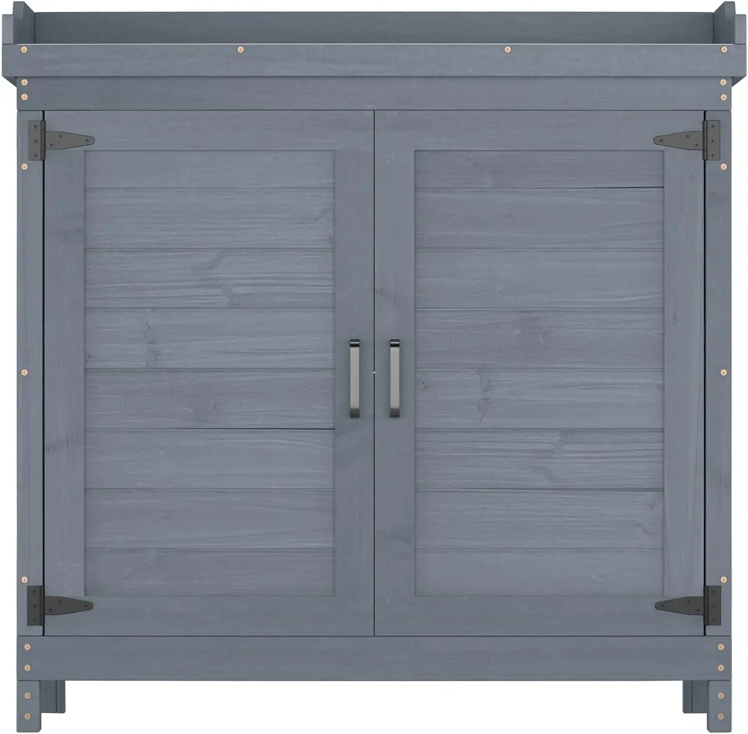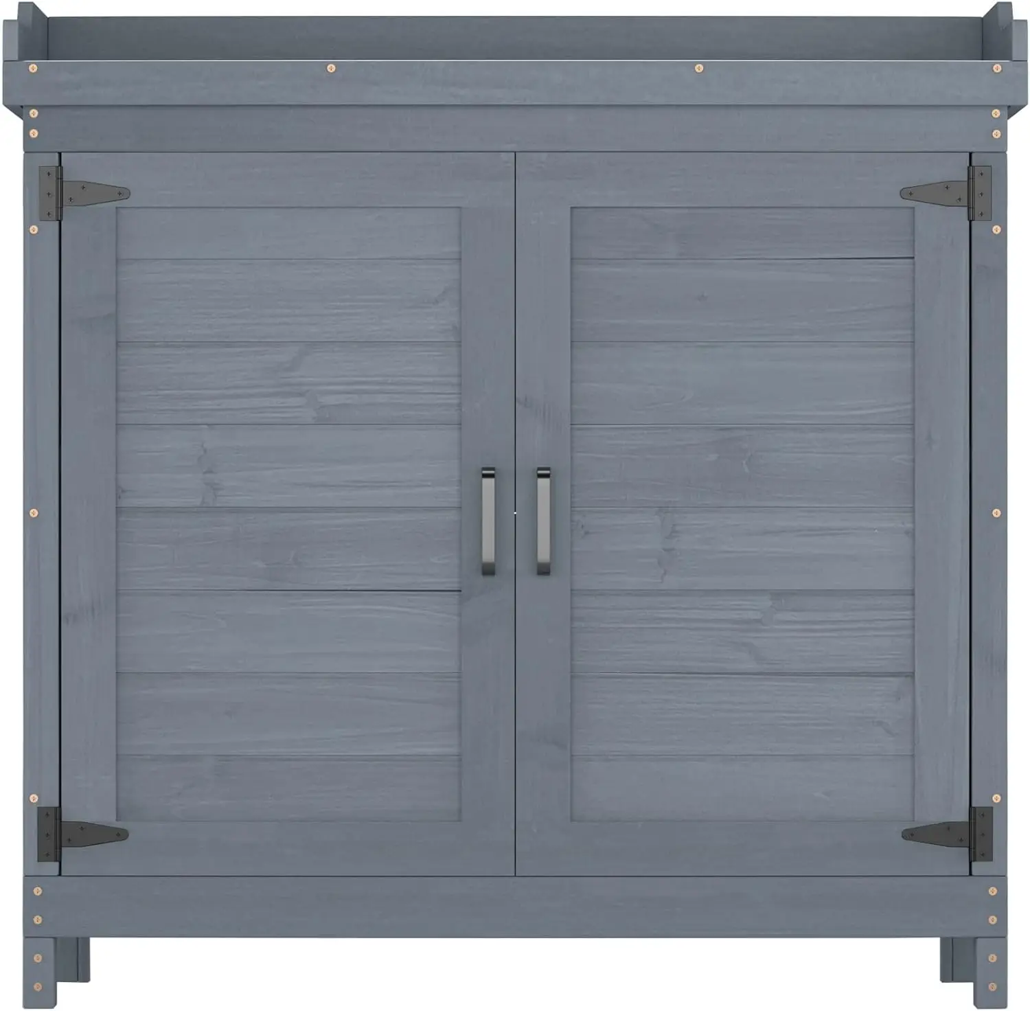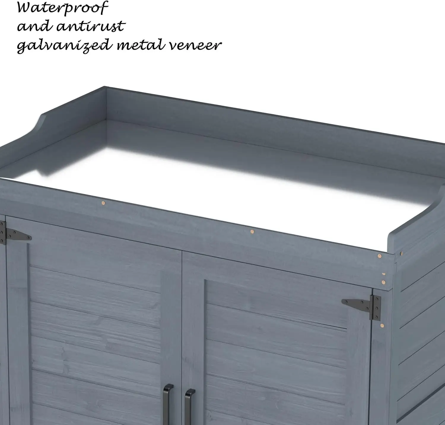 Outdoor Garden Patio Wooden Storage Cabinet Furniture Waterproof Tool Shed with Potting Benches Outdoor Work Station Table (Gray)