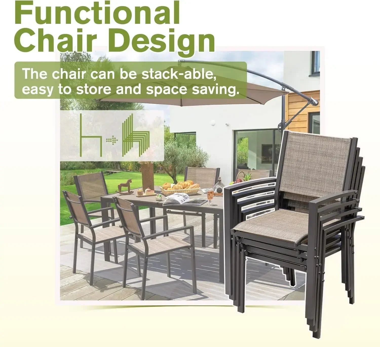 - Stackable Chairs: The patio table and chairs includes six chairs and a table, so you don't have to worry about not having enough chairs. It is ideal for dining with family and gathering with friends. The six chairs are stackable, which saves a lot of storage space and makes it easy to carry