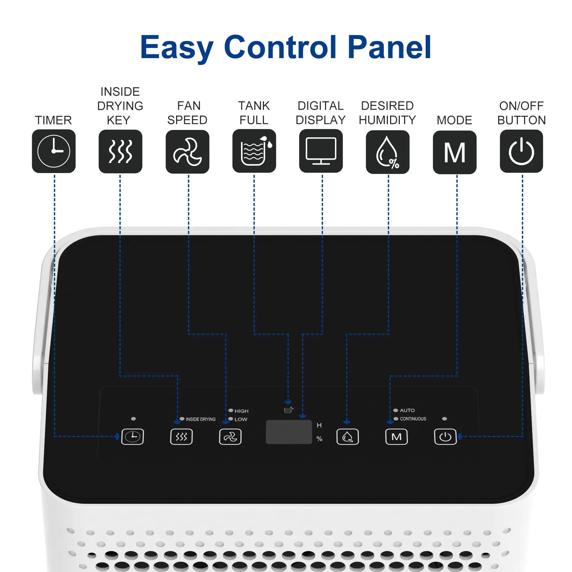 Function: Adjustable Humidistat,Auto Restart,Automatic Bucket Full Shut-Off,Automatic Defrost,Automatic Humidistat Control,Bucket Full Indicator Light,External Drain Connect,LED Display,Removable Water Tank,Washable Air Filter
