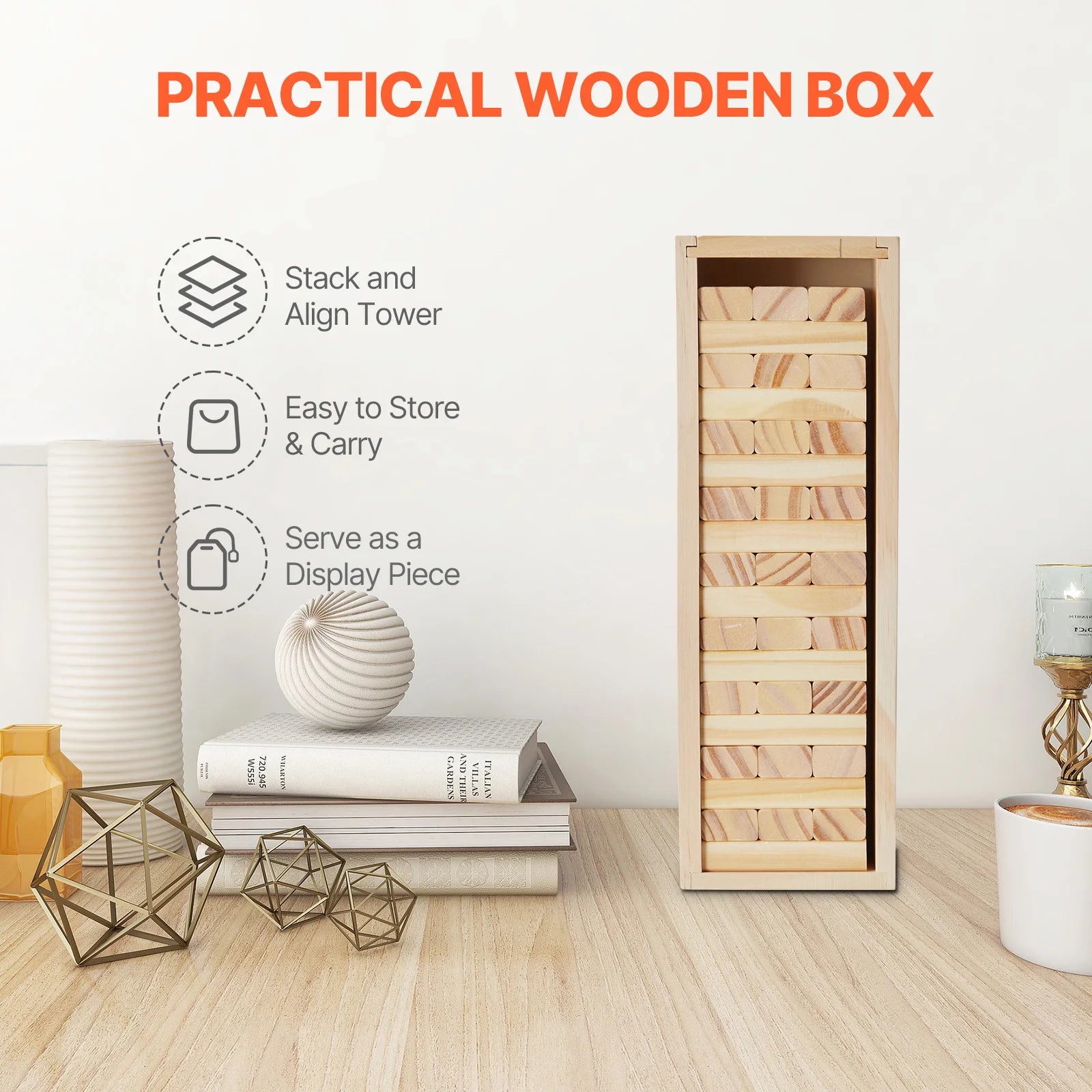 Customizable Gameplay: This game set comes with 54 blocks (3.0" x 1.0" x 0.6") that you can personalize by writing your own rules on the blank blocks or use them as decorative pieces; The tower can reach up to 2 feet for an exciting challenge.Easy and Engaging Fun: Designed to promote creativity, patience, and focus, this game is perfect for family entertainment; Its simple rules make it easy for anyone to join in on the fun, from kids to adults.Durable Pinewood Build: Made from high-quality, polished pine wood, this tumbling tower game is built to last; The smooth, non-toxic, and splinter-free finish ensures safe and comfortable handling, enhancing long-term enjoyment.Personalize Your Game: Unleash your creativity with the blank blocks; Whether you choose to doodle or add your own messages, these customizable pieces allow you to personalize the game to make it truly unique.Ideal for Social Events: Add excitement to any gathering with this fun and interactive game; It encourages communication, teamwork, and healthy competition, making it the perfect way to bond with family and friends.Versatile Storage Box: The included wooden box serves as both a stacking aid and a storage solution; It helps keep the blocks organized while also doubling as a decorative piece for your home or event.
