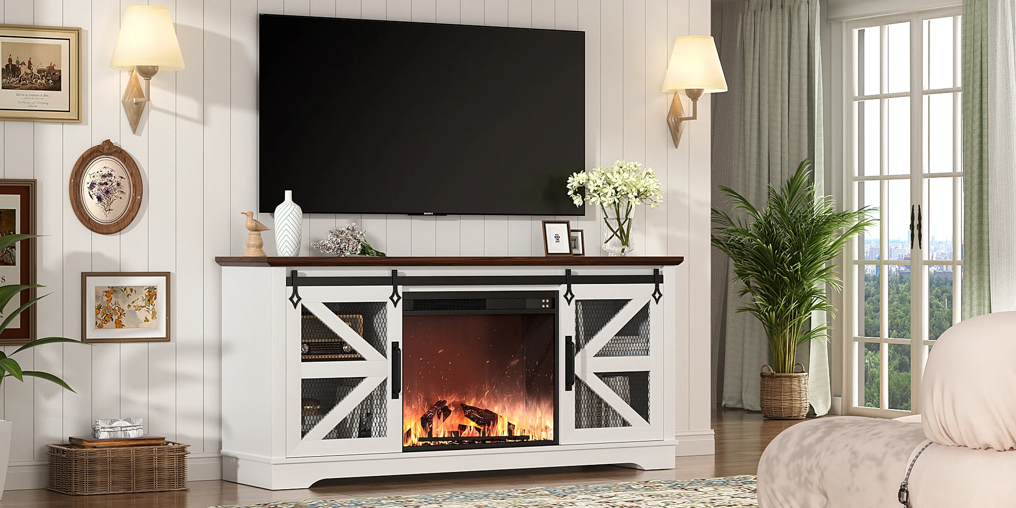 This farmhouse classic style TV stand is a perfect blend of modern and rustic farmhouse design, it measures 60“ L x 28.2 ‘H x 15.7’ W, it can fit up to a 60 inches TV, with two spacious storage cabinets and an electronic fireplace with 3D flame effect. There is plenty of space for your TV and related entertainment devices, the dividers in the storage cabinets can be freely adjusted, convenient for placing objects of different heights. All in all, this TV cabinet not only has very strong practical performance, but also can add personality and charm to your room, suitable for all decorative styles and increase the beauty of your living room or bedroom.