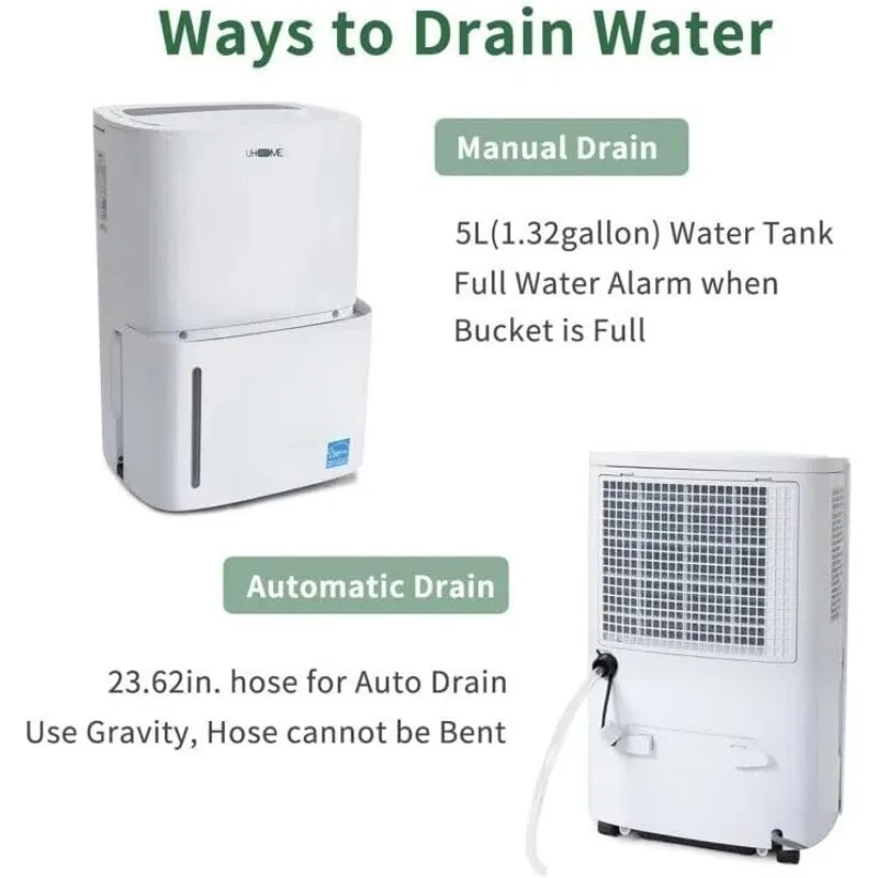 - 【EASY AND CONVENIIENT DRAINAGE】- Uhome dehumidifier offers 2 ways of drainage: empty the water tank (5L/1.32Gal) manually and continuous drainage with the equipped 23.6" drain hose. When the "Water full" indicator lights up, the display shows "FL" code and the dehumidifier shut off automatically at the same time, please remove the bucket and empty it. When attach the water hose to the dehumidifier, water can be automatically emptied into a floor drain. (We do not provide a water container)