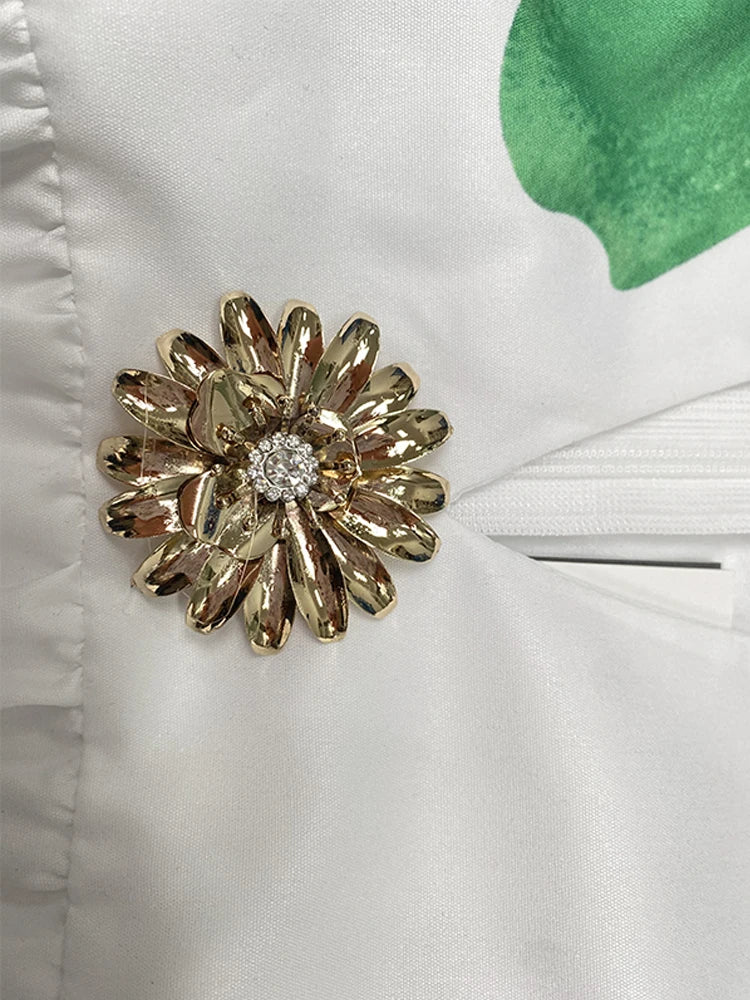Women Midi Shirts Dress Summer New Dress 2025 V-Neck Pleated Short Sleeves White Loose Casual Flower Print A-line Dresses
