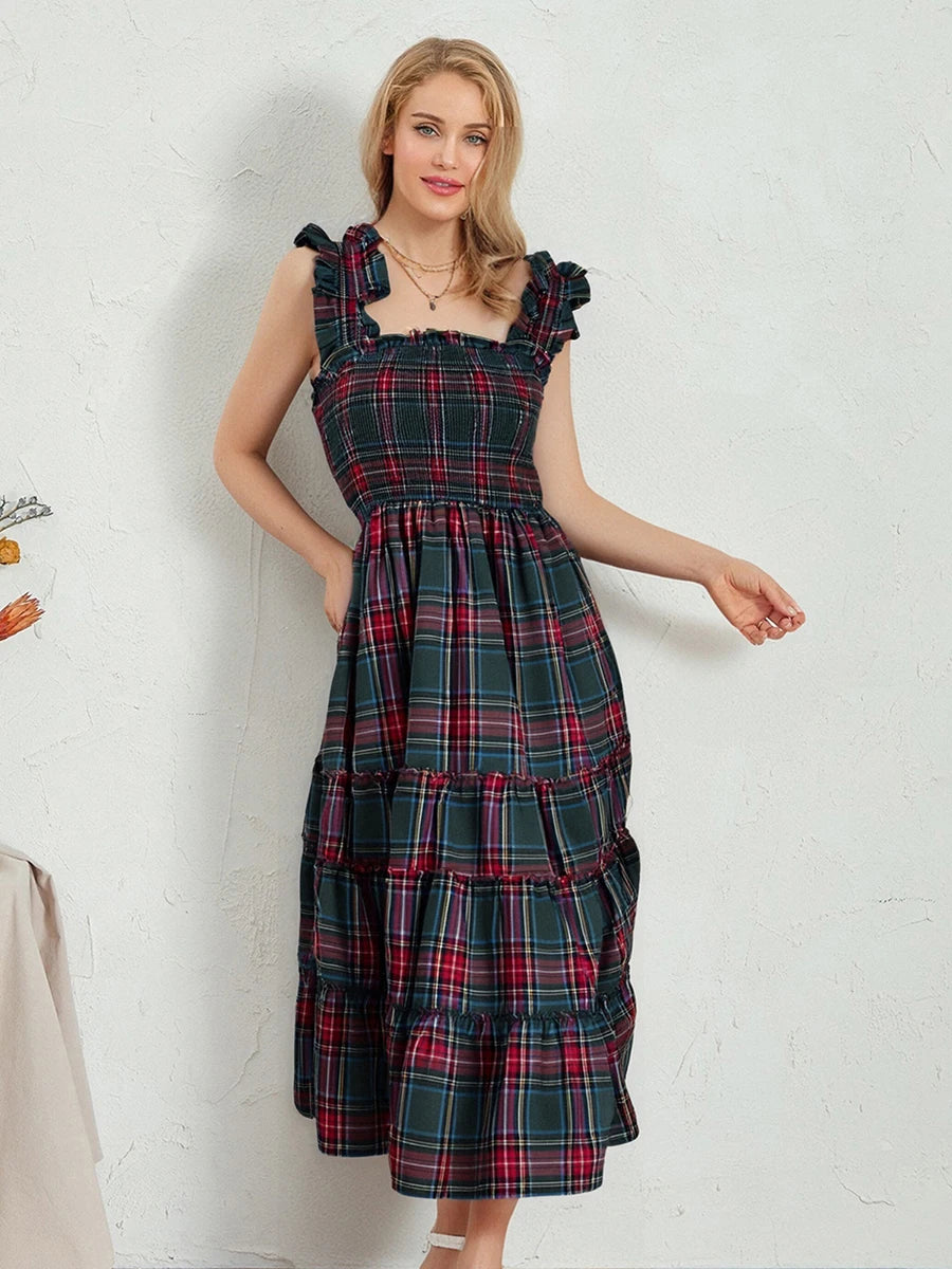 Vintage plaid print, sleeveless, square neckline, smocked chest, high waist, ruffled hem; Sleeveless dresses for women; A-line and mid-length design, easy to show your charming curves, perfect addition to your closet